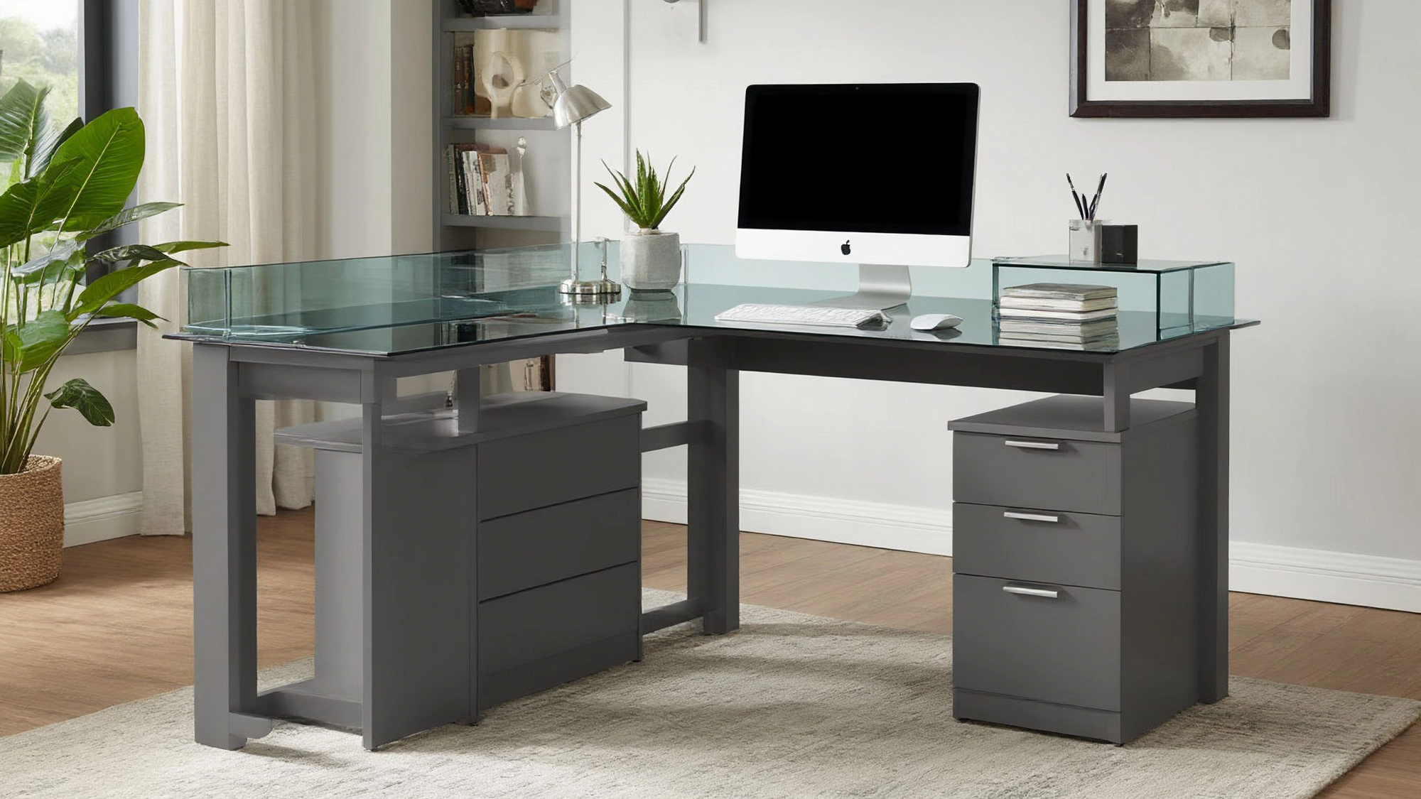 Угловой компьютерный стол «Сабрина» — это не просто предмет мебели, а настоящая находка для тех, кто ценит гармонию стиля и функциональности в своем рабочем пространстве. Этот современный стол с элегантными стеклянными элементами в сером цвете станет изюминкой вашего интерьера, придавая ему нотки утонченности и современности. Он идеально подходит как для дома, так и для офиса, создавая атмосферу, способствующую продуктивной работе и творческому процессу.