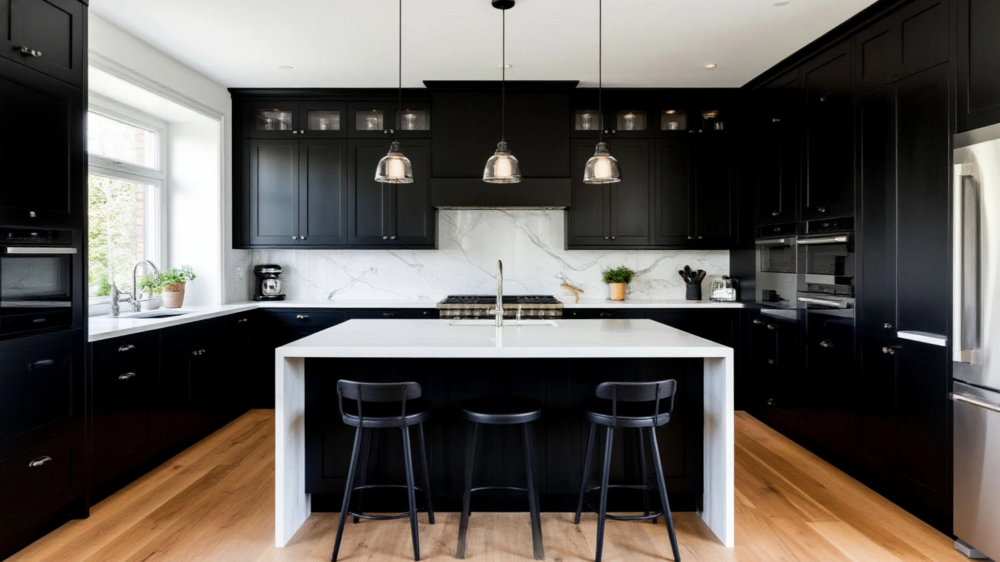 Дизайн кухни позволяет адаптировать интерьер под любые нужды: небольшие квартиры, просторные студии или загородные дома. Минималистичные формы и отсутствие лишних декоративных элементов делают пространство визуально свободным, а контраст черного и белого придает интерьеру динамику и современность.