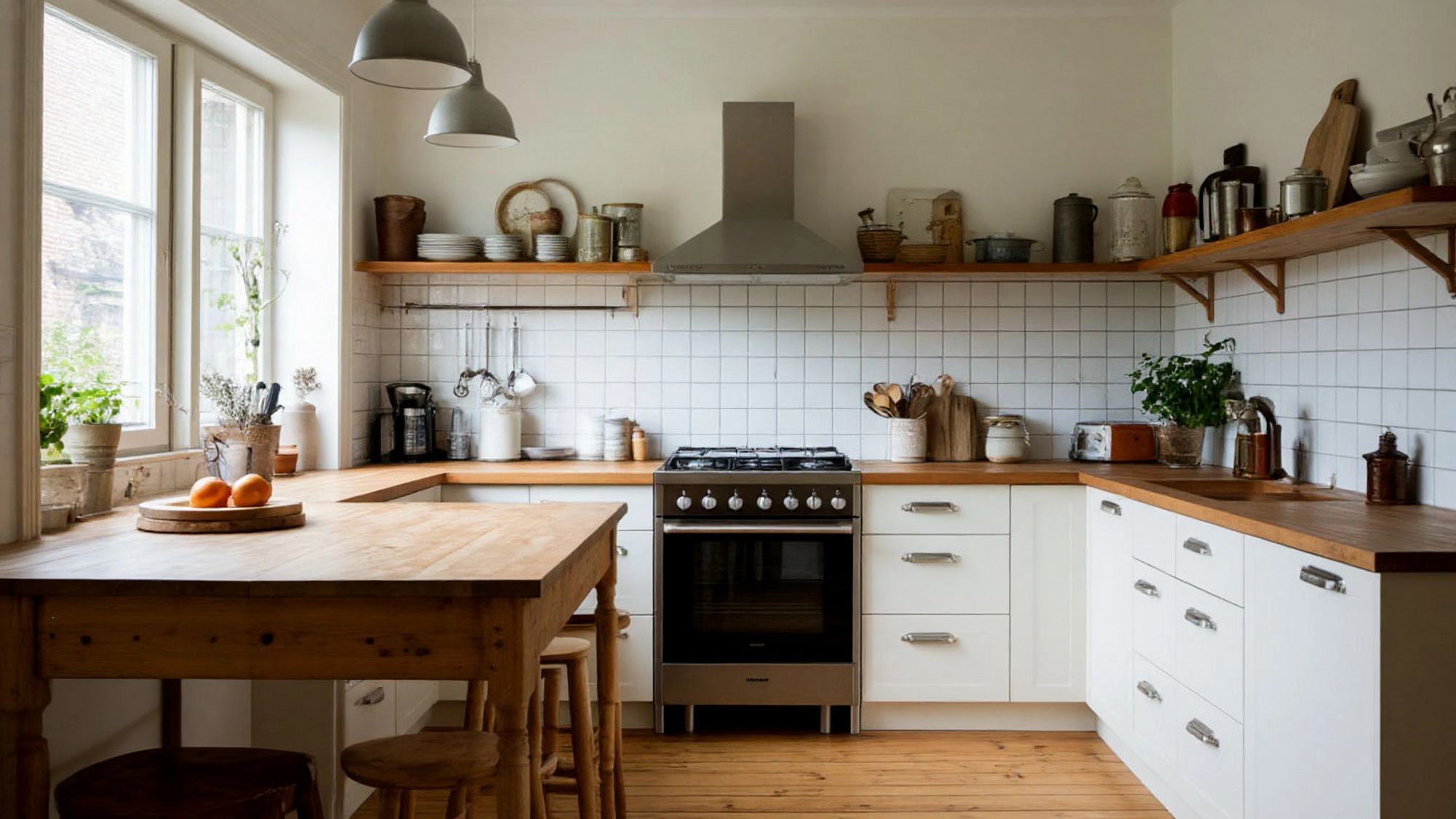 Светлые оттенки фасадов создают визуальную легкость и простор, что особенно важно для небольших кухонь. Отсутствие верхних шкафов делает интерьер более открытым и воздушным, при этом функциональность сохраняется за счет рационально организованных нижних модулей и открытых полок. Такой подход обеспечивает чистоту линий и гармонию пространства, что является характерной чертой скандинавского стиля.