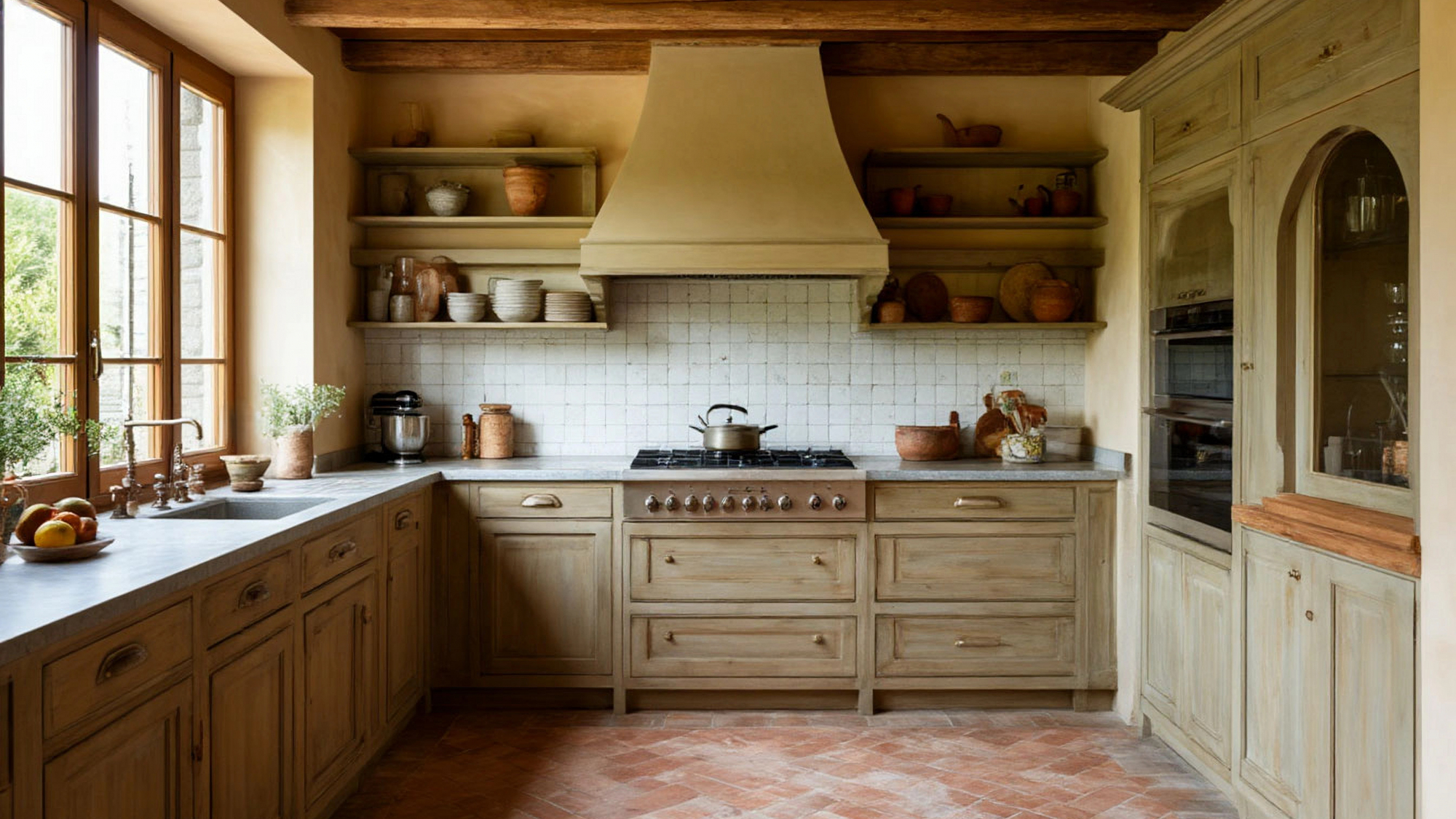 Цветовая палитра кухни создаёт атмосферу умиротворения и уюта. Кремово-бежевый оттенок фасадов легко сочетается с различными декоративными элементами, текстилем, керамикой и металлическими акцентами, создавая пространство, где хочется проводить время. Светлый тон фасадов отражает естественный и искусственный свет, делая помещение визуально более просторным и светлым, а отсутствие верхних шкафов усиливает этот эффект, позволяя воздуху и свету свободно циркулировать.