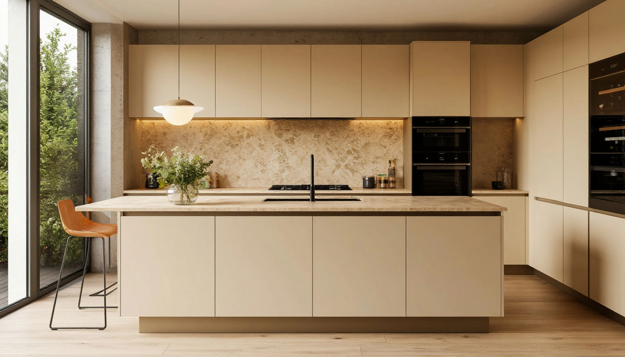 Особое внимание уделено деталям: аккуратные металлические ручки, продуманная подсветка, мягкие линии острова и рабочей зоны создают ощущение завершённости интерьера. Бежевый цвет фасадов играет важную роль в восприятии пространства: он делает комнату светлой, визуально увеличивает площадь и гармонирует с любыми отделочными материалами — от деревянного пола до плитки и камня.
